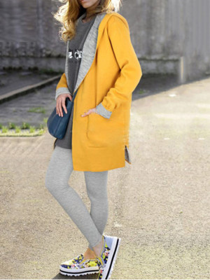 Hooded Patch Pocket Side Slit Plain Plus Size Jacket & Outwear
